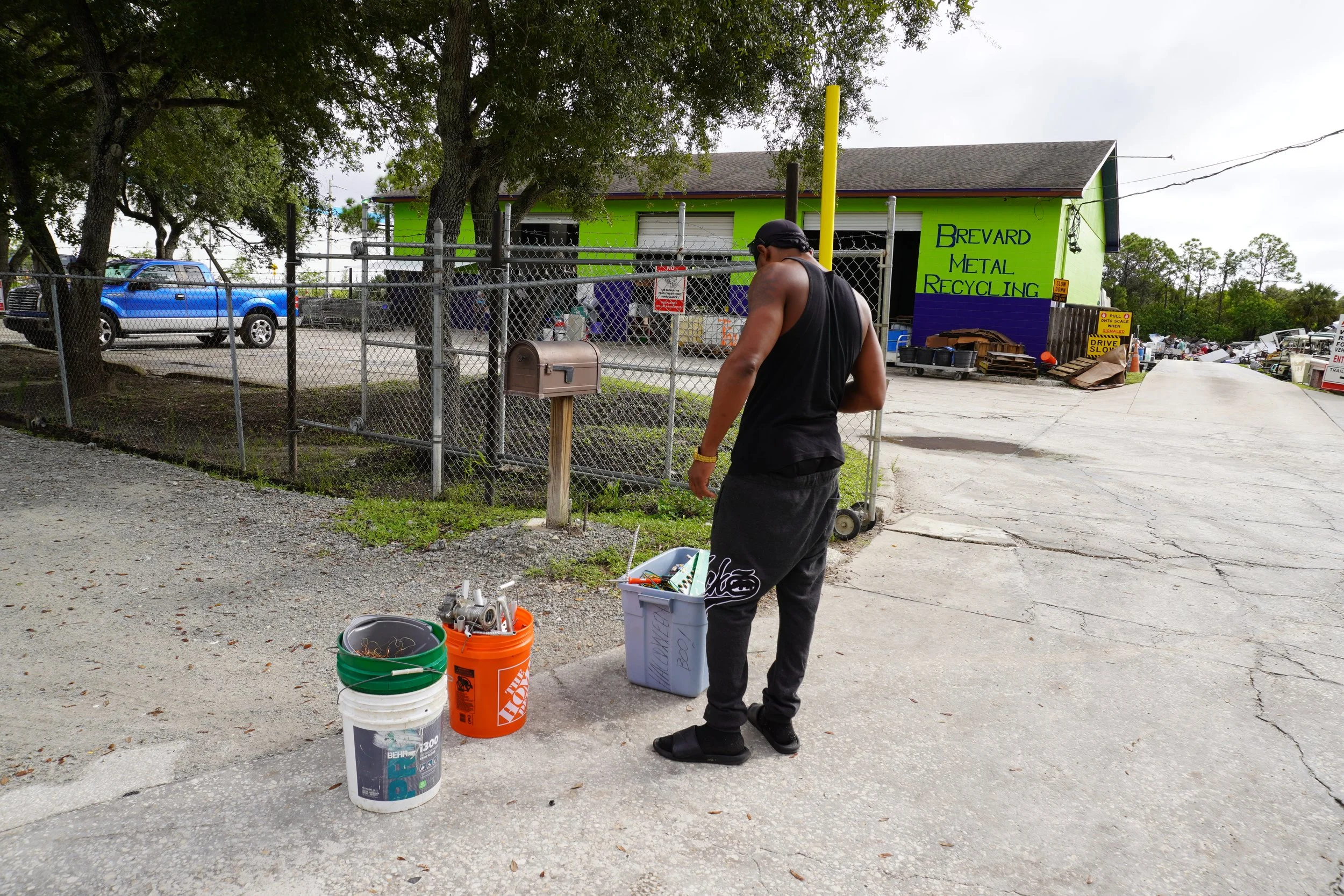 At a metal recycling yard in Melbourne, Jason sorts through buckets of aluminum and brass, salvaging what others discard. “Everybody’s trying to scrap and make a little money,” he said. “You find stuff people dump out by the road, clean it up, and bring it here. It’s not much, but it keeps me going.”