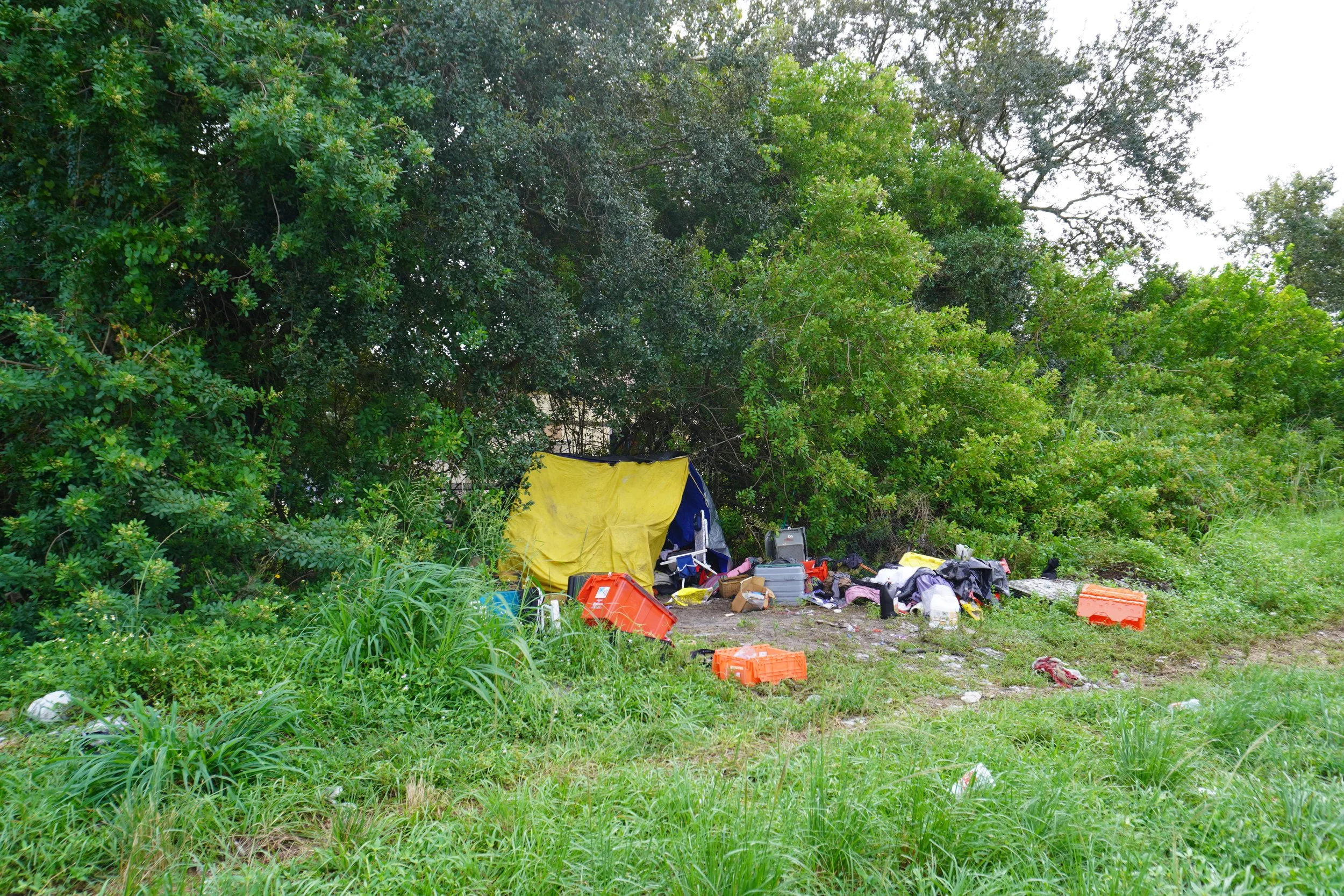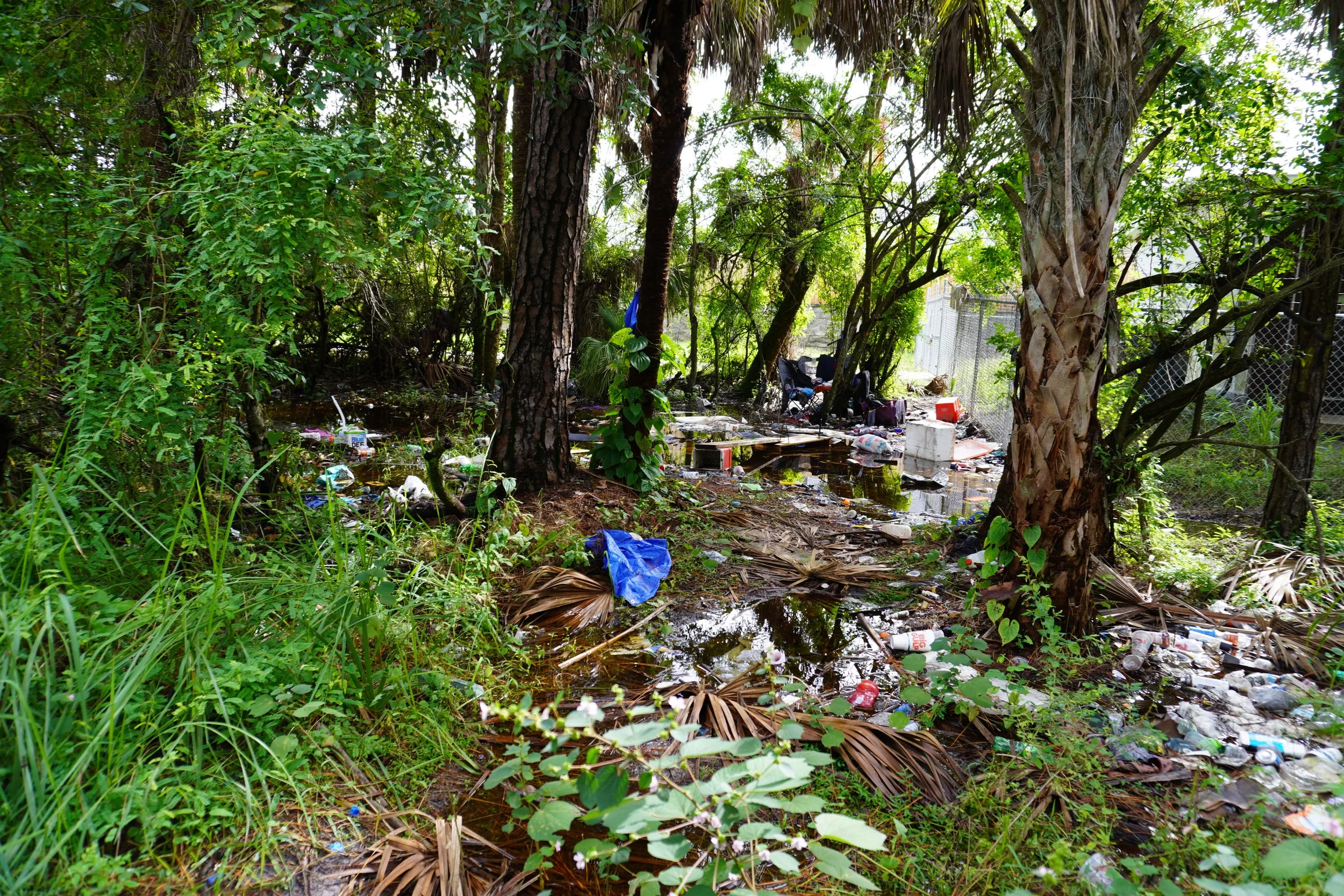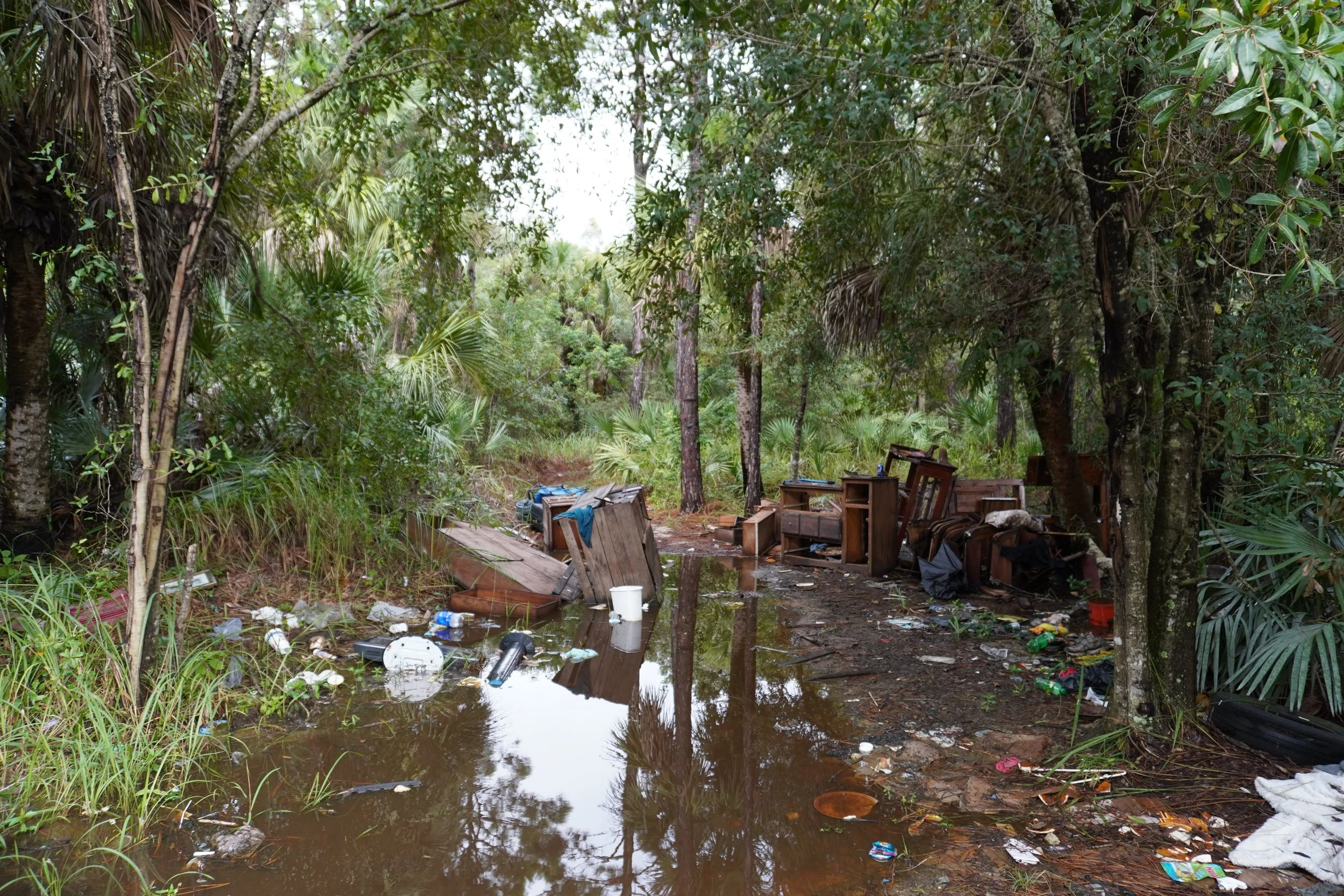 After weeks of rain, makeshift camps near Eau Gallie sit half-flooded, furniture sinking into the mud.