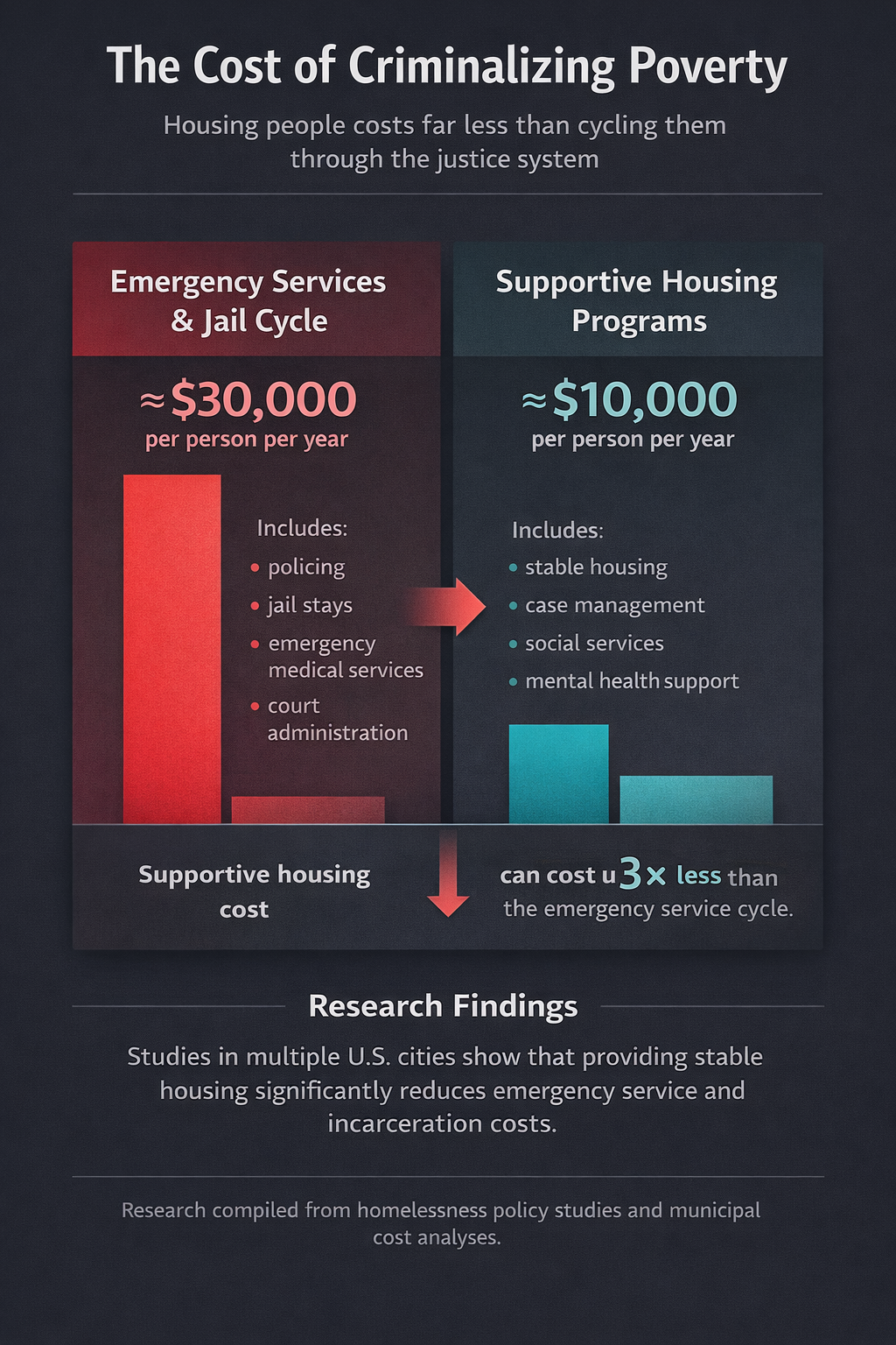 Research suggests supportive housing programs can cost significantly less than the combined expenses of policing, emergency services, and incarceration.