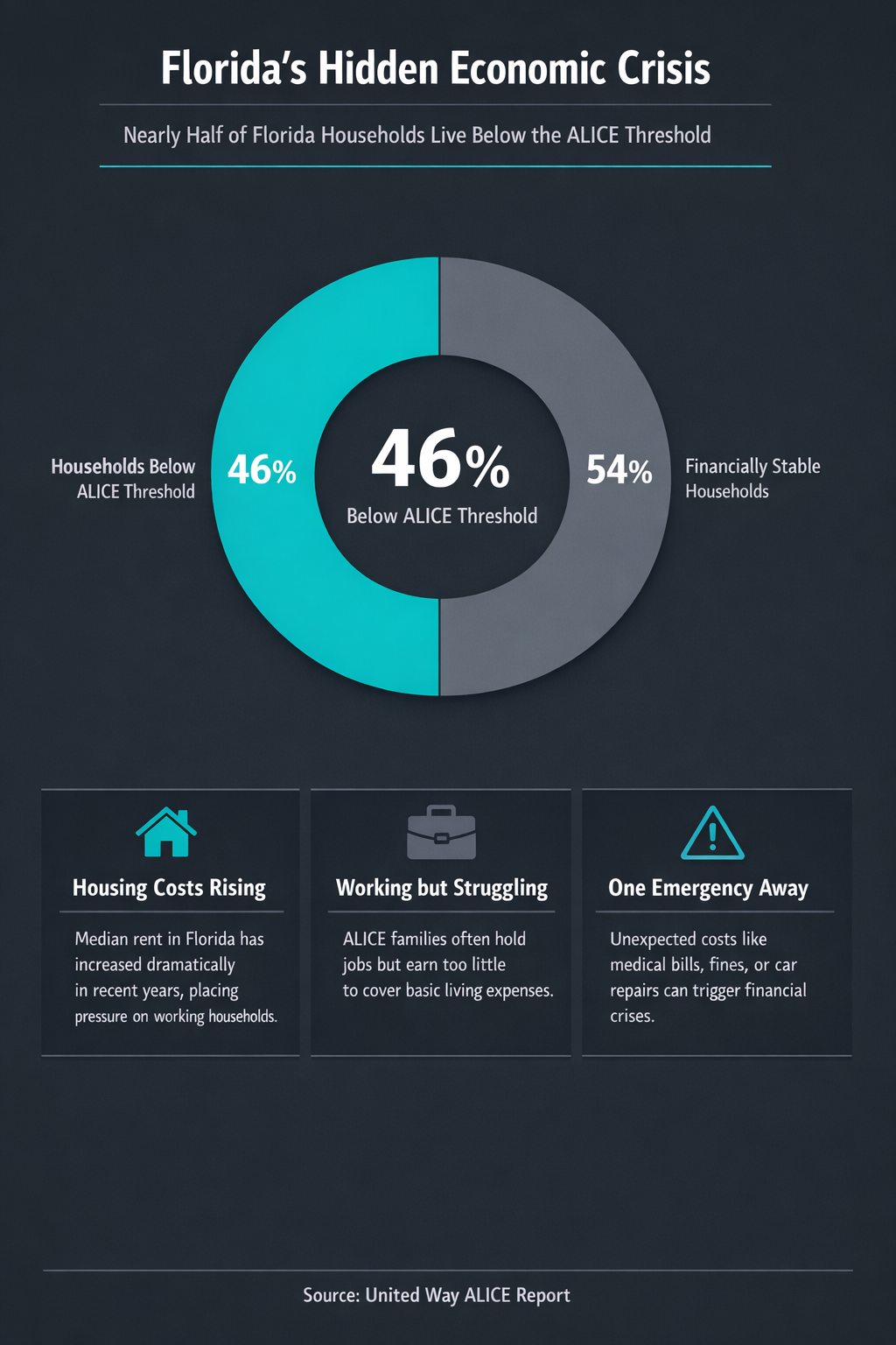 According to the United Way Worldwide, nearly half of Florida households fall into the ALICE category — Asset Limited, Income Constrained, Employed. These households earn above the federal poverty line but still struggle to afford basic necessities such as housing, food, transportation, and healthcare.