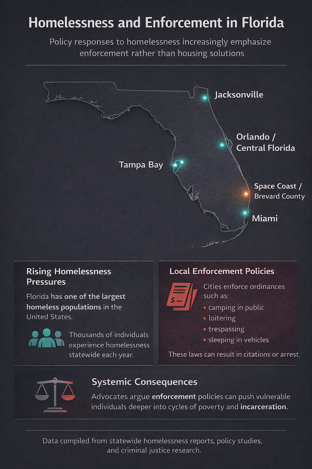 In Brevard County, where rising housing costs and economic pressure affect thousands of households, the issue raises difficult questions about how communities respond to poverty and whether enforcement alone can address challenges rooted in economic hardship.