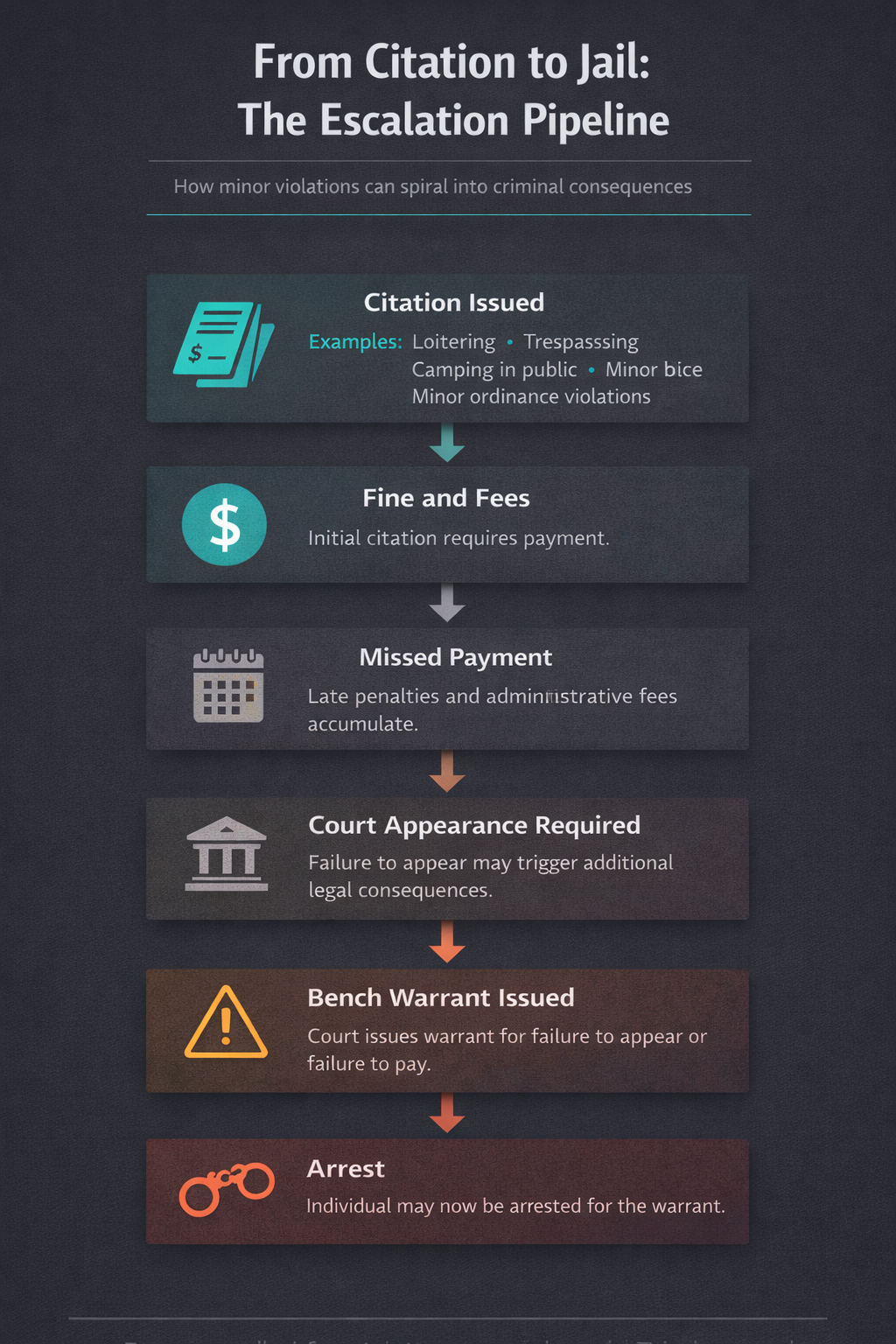 A citation can lead to administrative fees, missed court dates, warrants, and eventually arrest — even when the original violation involved a nonviolent offense.